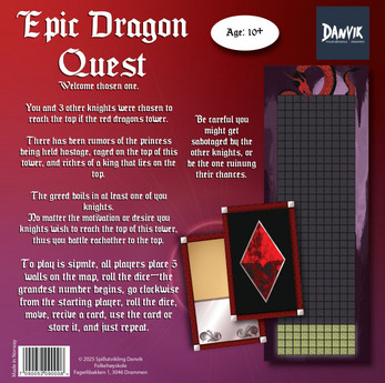 The board game ¨Epic Dragon Quest¨ is a fun and adventurous medieval based board game with up to 4 players. The game is simple you start at the bottom line and the goal is to reach the other side of the board/ top line. A little extra spice is added with wall placement to make it a little more challenging.